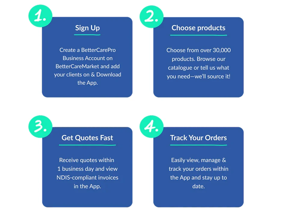 BetterCarePro is the NDIS product procurement platform that makes sourcing daily living aids and equipment simple for Homecare Providers. Access a wide range of Assistive Technology and Consumables in one place, with real-time tracking and streamlined deliveries. Let us take care of the admin so you can focus on providing exceptional care.