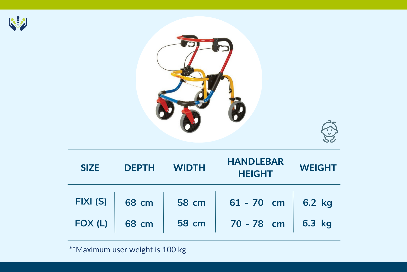 It comes in bright engaging colours, making sure to appeal to your child and encouraging them to use the rollator. It is available in 2 sizes: the Fixi for small children, while the Fox is for older children, young adults or small adults.